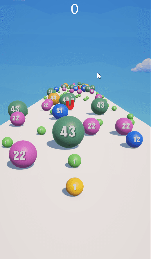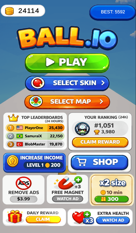 In Ball.io, players control a rolling sphere navigating an infinite procedural course. The core loop revolves around a dynamic scaling mechanic: players consume smaller colored balls to continuously grow in size, while dodging procedurally generated giant obstacles that scale relative to the player's current mass. Players collect coins, break high scores, and utilize powerful perks like the "Magnet" to dominate the board.